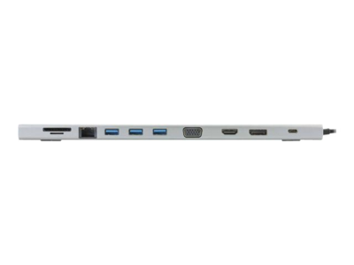 Connectez des écrans VGA, HDMI ou DisplayPort, des périphériques USB, connectez-vous au réseau par l'intermédiaire du port RJ45 Ethernet intégré. Cette station est équipée d'un lecteur de carte mémoire pour lire des informations depuis des cartes SD ou Micro SD. Raccordez l'alimentation de votre ordinateur sur le port USB-C pour le recharger lorsque vous utilisez la station d'accueil.