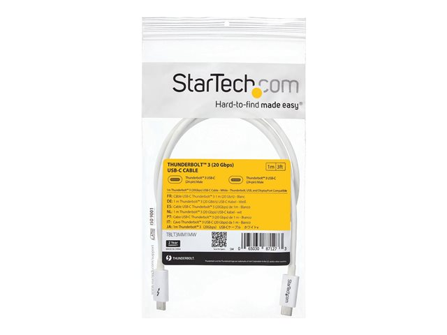 StarTech.com 3.3ft (1m) Thunderbolt 3 Cable, 20Gbps, 100W PD, 4K Video, Thunderbolt-Certified, Compatible w/ TB4/USB 3.2/DisplayPort - Câble Thunderbolt - 24 pin USB-C (M) pour 24 pin USB-C (M) - USB 3.1 Gen 2 / Thunderbolt 3 / DisplayPort 1.2 - 1 m - support 4K - blanc - pour P/N: CDP2HDUACP, CDP2HDUACPW TBLT3MM1MW