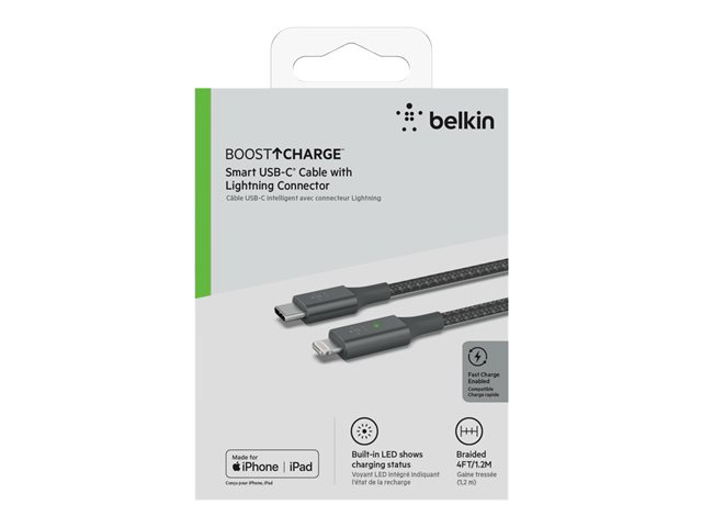 Belkin BOOST CHARGE Smart - Câble Lightning - 24 pin USB-C mâle pour Lightning mâle - 1.2 m - gris - Prise en charge de Power Delivery CAA006BT04GR