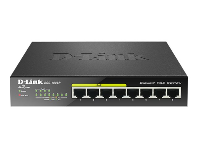 Le switch de bureau Gigabit PoE DGS-1008P est un moyen économique pour les télétravailleurs et les PME de bénéficier de la technologie Power over Ethernet (PoE). Les utilisateurs peuvent mettre sous tension des périphériques (points d’accès sans fil, caméras réseau ou téléphones IP) directement via les câbles réseau. Équipé de ports Gigabit pour une plus grande rapidité, le switch DGS-1008P intègre la technologie Green Ethernet de D-Link qui permet de réaliser des économies d’énergie lorsque le switch n’est pas en cours d’utilisation. Totalement silencieux grâce à une conception sans ventilateur, il est idéal pour les bureaux, les bibliothèques ou les salles de réunion.